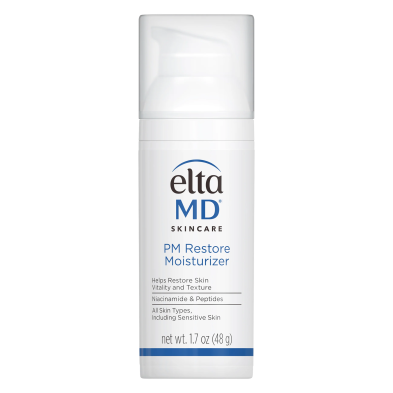 EltaMD PM Restore Moisturizer helps restore skin vitality and texture. Niacinamide and antioxidants help improve skin tone and texture, while hyaluronic acid and a ceramide hydrate and strengthen skin’s moisture barrier. The result is skin that looks softer, smoother and brighter. Non-comedogenic, fragrance-free.